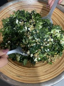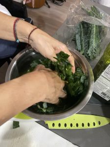 • Para cortar el kale, lavarlo y secarlo, quitarle la vena, masajear con aceite de oliva y después cortar.