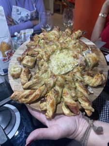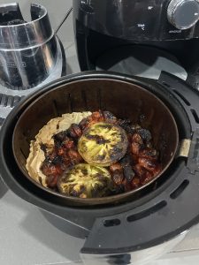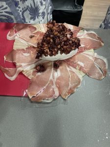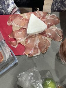 • Sobre un papel de airfryer , poner en redondo del centro hacia afuera unas tajadas de jamón Serrano y un queso brie encima.