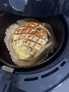 • Cortar los excesos de masa, adornarla y pincelarla con yema de huevo. Al airfryer a Fuego bajito