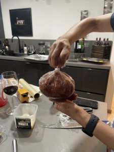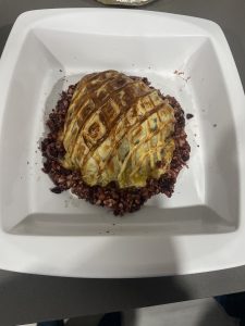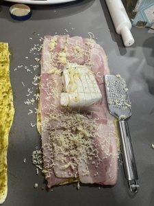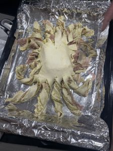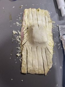 • Envolver el jamón sobre el queso con el crumble y taparlo con otra hoja de hojaldre por encima