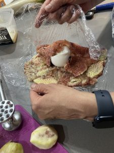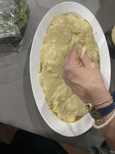 • Tapar con el otro lado de la masa que está untada de la pasta de pesto. Cortar pedazos para poder entochar
