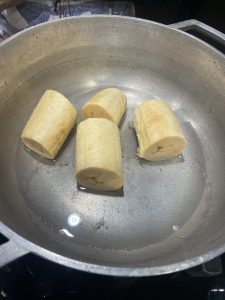 • Pelar y cortar el plátano en pedazos y cocinarlos primero en un poco de agua