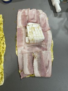 • Por encima las tajadas de tocino y en el centro el queso brie cortado