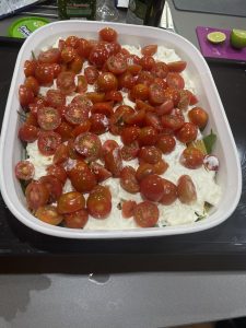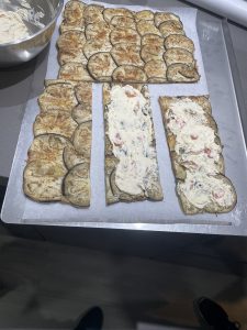 • Cortar según el número y esparcir el relleno encima de las berenjenas. En este caso, usamos queso crema con tomate perejil sal pimienta.