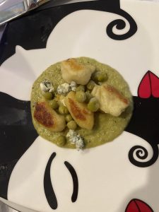 • En el plato, se pone la salsa como base , los gnocchis y alverjas con los zucchinis redondos