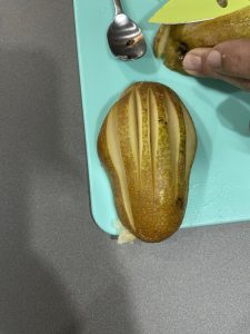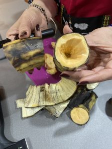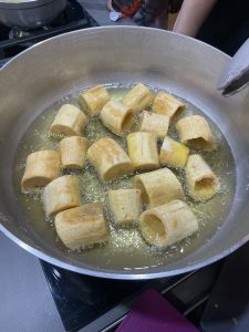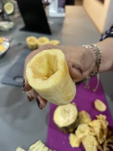 • Partir los plátanos en pedazos grandes, sacar relleno del centro sin llegar a la base