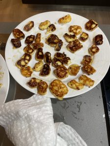 • Aparte: derretir mantequilla en un sartén para dorar el queso partido en cubos