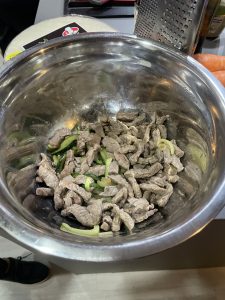 • Cortar la carne en larguitos delgados