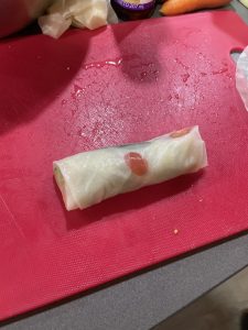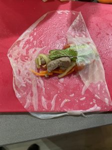 • Mojar cada hoja de papel de arroz en un plato, por lado y lado, pasarla a una tabla, poner la mezcla de la carne y las verduras y envolver los rollitos.