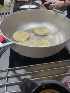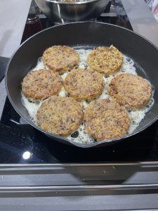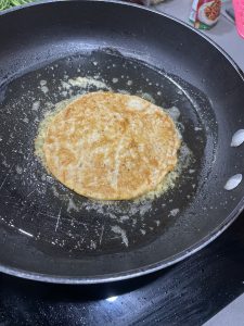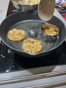 • Para hacer las tortillas : En un sartén calentar aceite y poner anillos de metal para contener el arroz. Llenar más o menos los anillos con un cm de la mezcla.