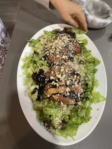 • Poner las bolas de mozzarella sobre la lechuga, la vinagreta, las nueces picadas y reducción de balsámico.
