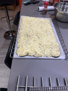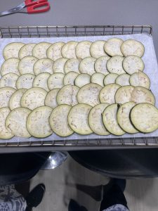 • Cortar en la,unas delgadas y redondas las en berenjenas y ponerlas en una reja que va al horno sobre un papel encerado untándolo previamente, con aceite en spray o con la ayuda de una brocha.