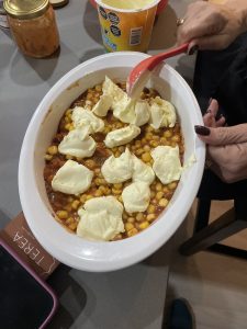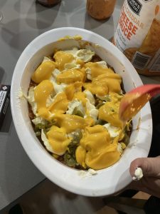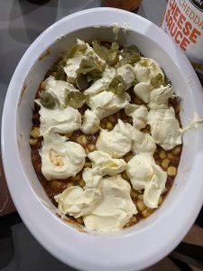 • Luego los sólidos: en la base del molde chile con carne previamente mezclado con la salsa, encima maíz, unos jalapeños, o jugo de jalapeños y por encima, crema agria sin esparcir.